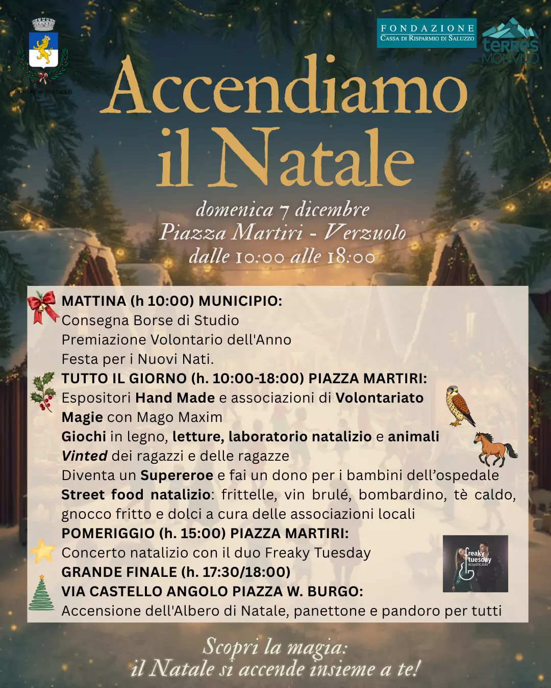 Dalle 10:00, Piazza Martiri si trasformerà in un villaggio incantato. Tra gli espositori di Hand Made e le associazioni di Volontariato, i visitatori potranno assistere alle magie del Mago Maxim e curiosare tra i banchi delle Pro Loco di Verzuolo e della Villa e l'associazione I Ciat Ca Rampignu che offriranno un assaggio dei sapori più tipici delle feste: gnocchi fritti, tè caldo, vin brulé, bombardino e dolci. I bambini e le bambine avranno il loro spazio speciale con giochi in legno, letture animate, laboratori natalizi e persino la presenza di cavalli e rapaci.