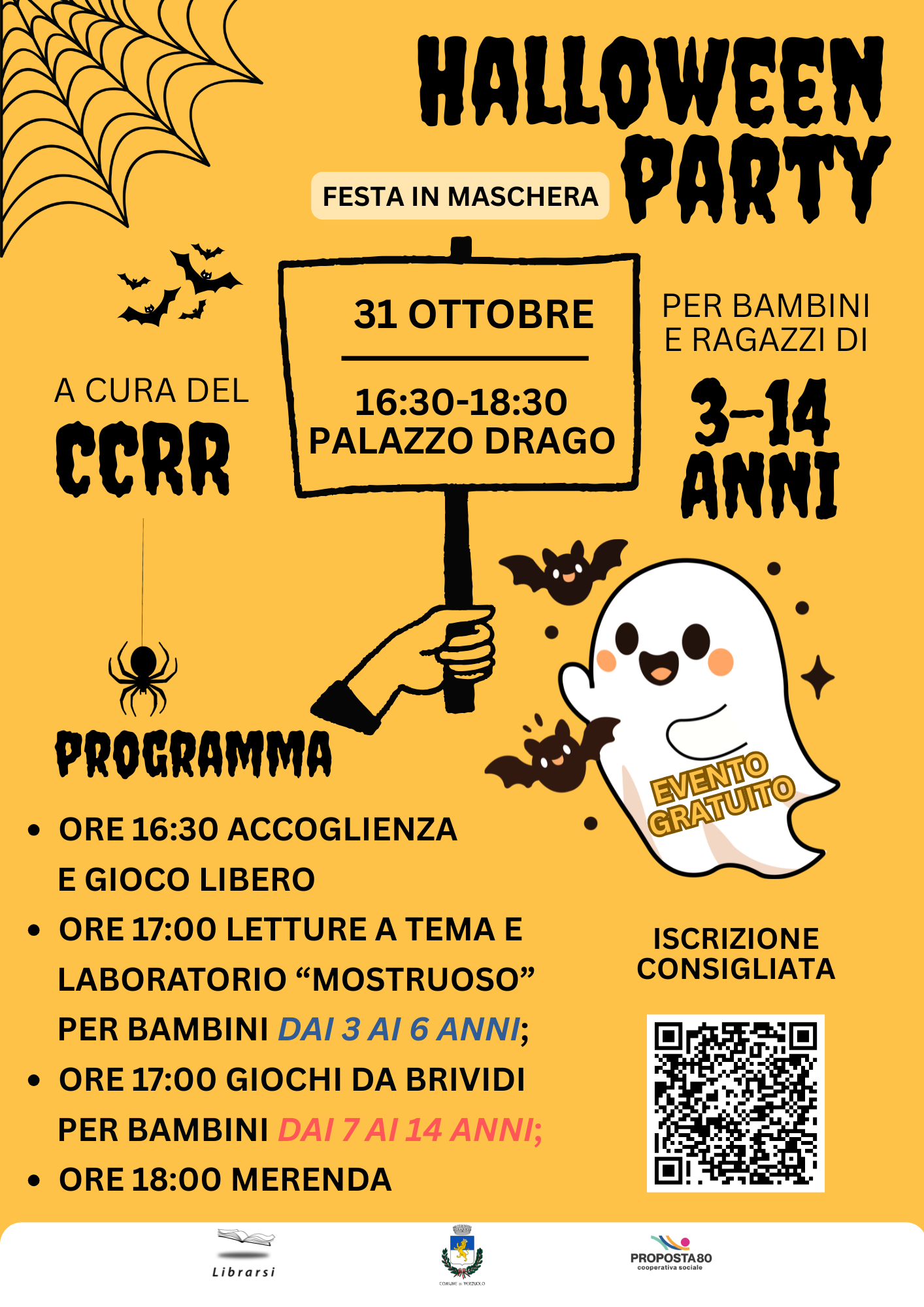 Il Consiglio Comunale dei Ragazzi e delle Ragazze (CCRR) invita tutti i bambini e i ragazzi dai 03 ai 14 anni a un pomeriggio "mostruosamente" divertente per festeggiare insieme Halloween ! Tra giochi, travestimenti, letture e laboratori, Palazzo Drago si trasformerà in un piccolo mondo da "brividi", dove streghe, fantasmi e zucche sorridenti saranno i protagonisti. Un'occasione per stare insieme, divertirsi e condividere l'allegria di una festa pensata dai ragazzi...... per i ragazzi !